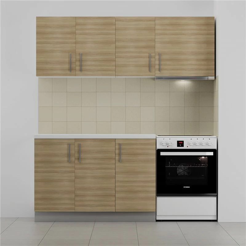Κουζίνα Ελληνικής Κατασκευής , εξαιρετικής ποιότητας και υψηλής αντοχής,κατάλληλη για μικρούς η στενούς χώρους. Στην κουζίνα περνάτε τις περισσότερες ώρες της ημέρας, πρόκειται για το δωμάτιο που έχει συνδυαστεί περισσότερο με τις οικογενειακές στιγμές και αναμνήσεις, για αυτό φροντίστε τον χώρο όσο καλύτερα μπορείτε, επιλέγοντας έπιπλα και χρώματα στο γούστο και στυλ σας. Το συγκεκριμένο σετ κουζίνας απαρτίζεται από τρία ντουλάπια στο πάνω μέρος,1 κουτί 40×33,5x60cm, ένα κουτί 80×33,5x60cm και ένα κουτί 60×33.5x60cm, και δύο στο κάτω μέρος ένα κουτί 40x56x82cm και ένα κουτί 80x56x82cm,των οποίων τα πορτάκια είναι 18mm,σε ιδιαίτερη φυσική απόχρωση με έντονα νερά, ένα χρώμα που θα τραβήξει σίγουρα την προσοχή και θα κεντρίσει το ενδιαφέρον, προσφέροντας ζεστασιά και διαχρονικότητα στον χώρο. Τα ντουλάπια μπορούν να τοποθετηθούν σύμφωνα με τις ανάγκες του χώρου σας και σύμφωνα με την αισθητική σας. Το σετ περιλαμβάνει μονοκόμματο, ανθυγρό πάγκο 120cm και πάχους 3.8cm,σε λευκή απόχρωση, εξαιρετικής ποιότητας, που δένει αρμονικά με το χρώμα των ερμαρίων. Επίσης, διαθέτει μπάζα inox για την κάλυψη του ανοιχτού χώρου των κάτω ντουλαπιών. Τέλος, το σετ διακοσμείται με πόμολα σε γκρι απόχρωση. Ο χώρος της κουζίνας είναι το επίκεντρο του σπιτιού σας, διακοσμήστε την όπως ονειρεύεστε.