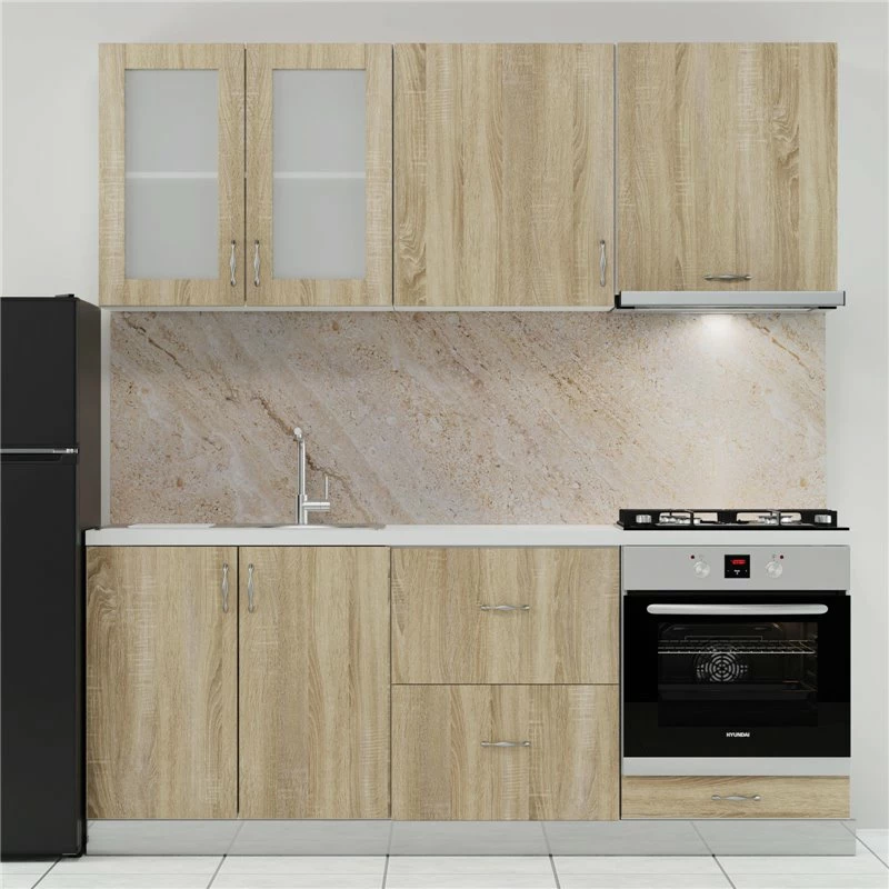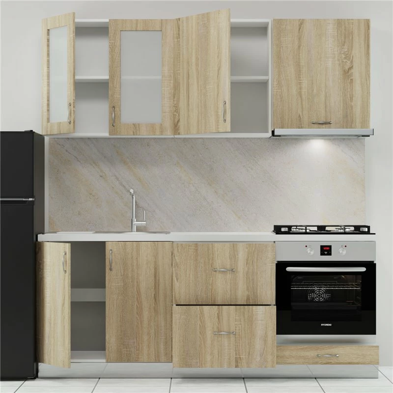Κουζίνα Modest, Σετ Έξι Κουτιών, Ευρωπαϊκής Κατασκευής, εξαιρετικής ποιότητας και υψηλής αντοχής, σε απόχρωση Σονόμα. Το σετ απαρτίζεται από: Άνω Κουτιά: • Ένα Σονόμα Ντουλάπι-Βιτρίνα 80x30x72cm, με δύο ανοιγόμενα πορτάκια, εσωτερικό ράφι και μεταλλικα χερούλια. • Ένα Σονόμα Ντουλάπι Αποροφητήρα 60x30x68m, με ανοιγόμενο πορτάκι και μεταλλικό χερούλι. • Ένα Σονόμα Ντουλάπι 60x30x72cm, με ένα ανοιγόμενο πορτάκι , εσωτερικό ράφι και μεταλλικό χερούλι. Κάτω Κουτιά: • Ένα Σονόμα Ντουλάπι Νεροχύτη 80x48x82cm, με δύο ανοιγόμενα πορτάκια, μεταλλικά χερούλια, και ενιαίο χώρο αποθήκευσης. • Ένα Σονόμα Ντουλάπι-Συρταριέρα 60x48x82cm, με δύο συρτάρια και μεταλλικά χερούλια. • Ένα Σονόμα Ντουλάπι Φούρνου 60x48x82cm, με ένα ανοιγόμενο συρτάρι και μεταλλικό χερούλι. Η κουζίνα αυτή μπορεί να επεκταθεί αγοράζοντας και άλλα ντουλάπια της κατηγορίας Modest. ΤΑ ΚΑΤΩ ΝΤΟΥΛΑΠΙΑ ΕΙΝΑΙ ΣΤΟ ΕΠΑΝΩ ΜΕΡΟΣ ΤΟΥΣ ΑΝΟΙΧΤΑ ΚΑΙ ΔΕΝ ΠΕΡΙΛΑΜΒΑΝΟΥΝ ΠΑΓΚΟ ΚΑΙ ΝΕΡΟΧΥΤΗ. Αν σχεδιάζεις το νέο σου σπίτι ή ακόμη αν σκέφτεσαι να ανακαινίσεις το παλιό, πρέπει να δώσεις απαραίτητη σημασία στο χώρο της κουζίνας. Ο χώρος αυτός αποτελεί εκτός από χώρο δημιουργίας και χώρο συγκέντρωσης της οικογένειας, δεν είναι τυχαίο άλλωστε που έχει συνδυαστεί με τις περισσότερες αναμνήσεις. Για αυτό για τον σχεδιασμό του χώρου επιβάλλεται να γίνει χρήση υλικών υψηλών προδιαγραφών με γνώμονα την αισθητική και το γούστο σας. Η κουζίνα είναι το επίκεντρο του σπιτιού σας , διακοσμήστε την όπως ονειρεύεστε. *ΣΤΟ ΣΕΤ ΔΕΝ ΠΕΡΙΛΑΜΒΑΝΟΝΤΑΙ ΟΙ ΗΛΕΚΤΡΙΚΕΣ ΣΥΣΚΕΥΕΣ, Η ΒΡΥΣΗ, Ο ΠΑΓΚΟΣ, Ο ΝΕΡΟΧΥΤΗΣ ΚΑΙ Η ΜΠΑΖΑ.